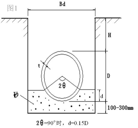 玻璃鋼地埋儲罐就位,應注意基礎鑿平,檢驗平整度。罐體土弧基礎支撐角不小于90°,罐體土弧基礎支撐范圍內(nèi)罐體腋角部位要采用細沙或中砂填充密實,與罐壁緊密接觸,不得用土或其他材料填充。地埋儲罐頂部回填沙同基礎做法。(例如100立方:D=3100mm,d=500mm,Bd=5000mm(T型開挖,適當放坡,底部寬度不得小于4000mm),H=覆土深度,根據(jù)現(xiàn)場實際情況。