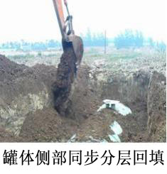 設備就位后平穩(wěn)放置罐體,回填土方應采取先回填罐體腋角夾角及罐體四周兩側(cè)穩(wěn)定夯實,土方穩(wěn)定罐體后注水保平穩(wěn)沉降?;靥钔练揭M行篩選無尖角石塊及建筑垃圾。土方回填杜絕鉤機、鏟車高空拋擲土方渣土從罐體上部重力沖擊回填,罐體注水應與分層回填夯實土方同步,且灌水注入口不得單獨從罐體進水口、出水口或清掏口單獨注水,應從兩處清掏孔同步進水,保證地埋儲罐內(nèi)部進水水壓平衡。灌水沉降后按圖紙標高連接外網(wǎng)管道并保證密封處理,灌水量分時段注入,總水量不低于設備容積的2/3以保障罐體與承重地基平穩(wěn)沉降。在雨季施工時,要有排水措施,防止基坑積水及邊坡坍塌,同時將罐體內(nèi)注水防止漂移而造成位移。